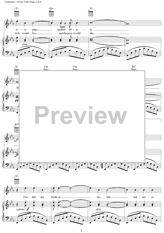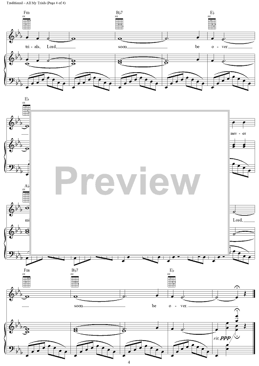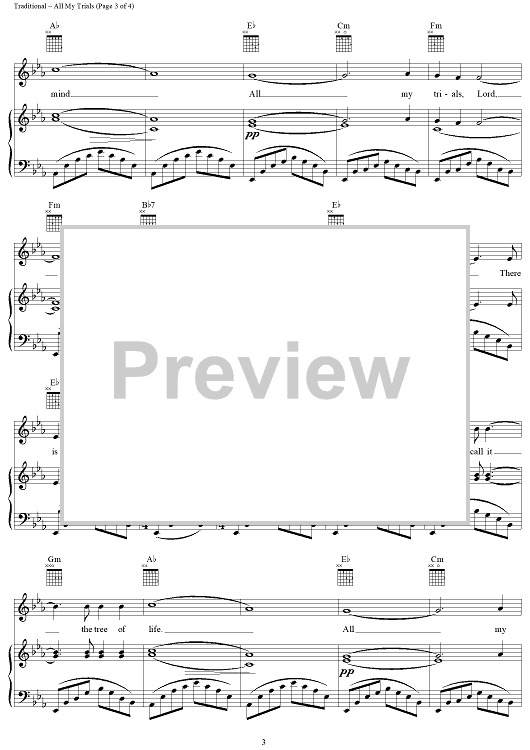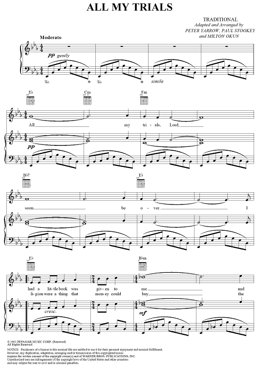 Digital Sheet Music for All My Trials by Paul Stookey, Milton Okun, Peter Yarrow, Peter, Paul and Mary, Traditional scored for Piano/Vocal/Chords; id:124175
