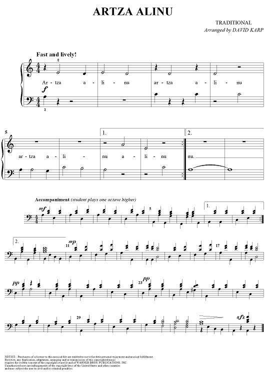 Digital Sheet Music for Artza Alinu by David Karp, Traditional scored for Easy Piano/Vocal; id:260395