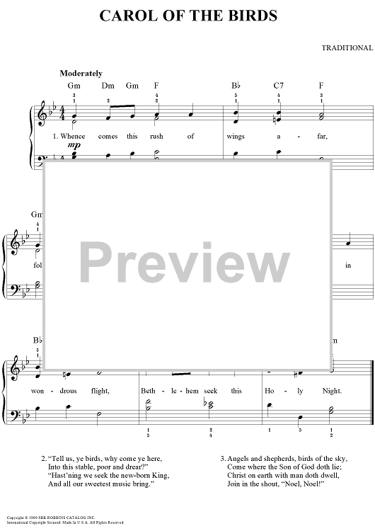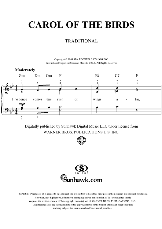 Digital Sheet Music for Carol of the Birds by Traditional scored for Easy Piano/Vocal; id:260646