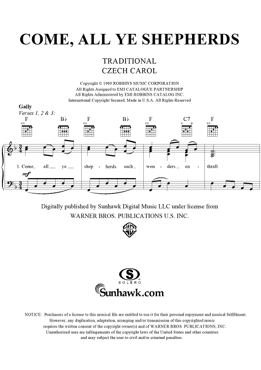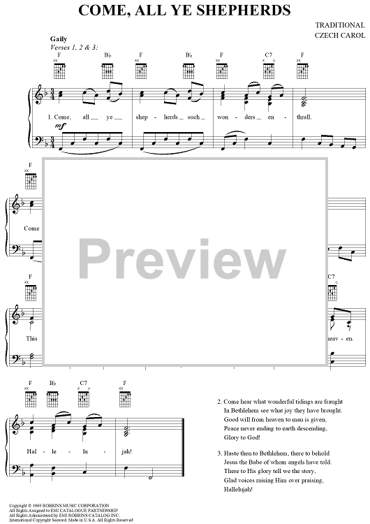 Digital Sheet Music for Come, All Ye Shepherds by Traditional scored for Piano/Vocal/Chords; id:260269