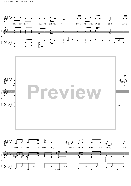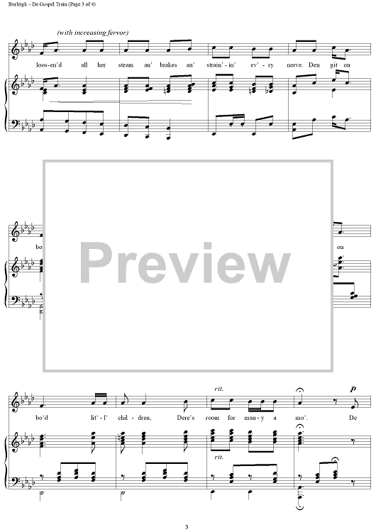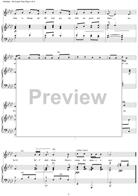 Digital Sheet Music for De Gospel Train ("Git On Bo'd Lit'l' Children") by H. T. Burleigh, African American Spiritual scored for Piano/Vocal; id:433134