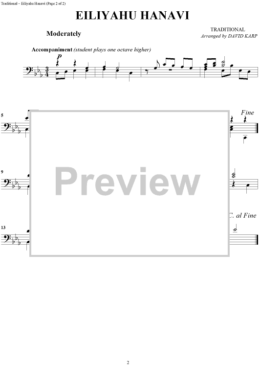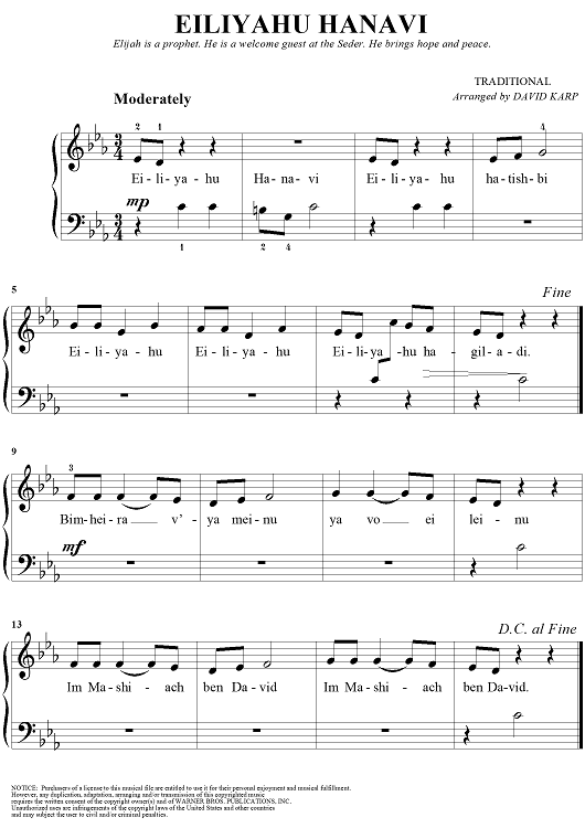 Digital Sheet Music for Eiliyahu Hanavi by David Karp, Traditional scored for Easy Piano/Vocal; id:260552