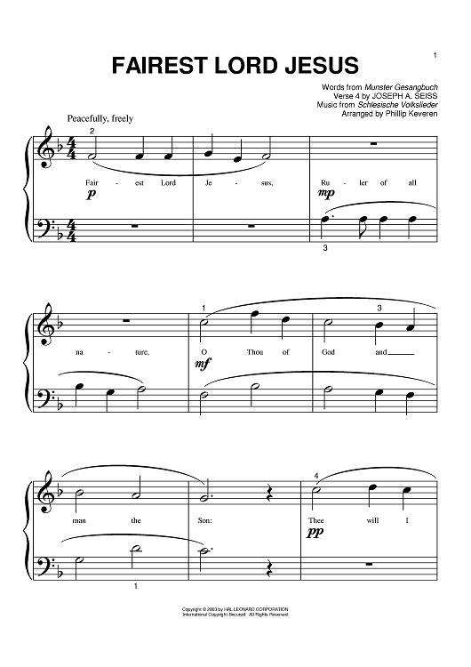 Digital Sheet Music for Fairest Lord Jesus by Munster Gesangbuch, Phillip Keveren, Joseph August Seiss, Schlesische Volkslieder scored for Big Note Piano; id:372924