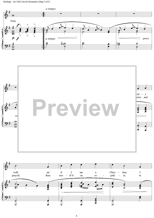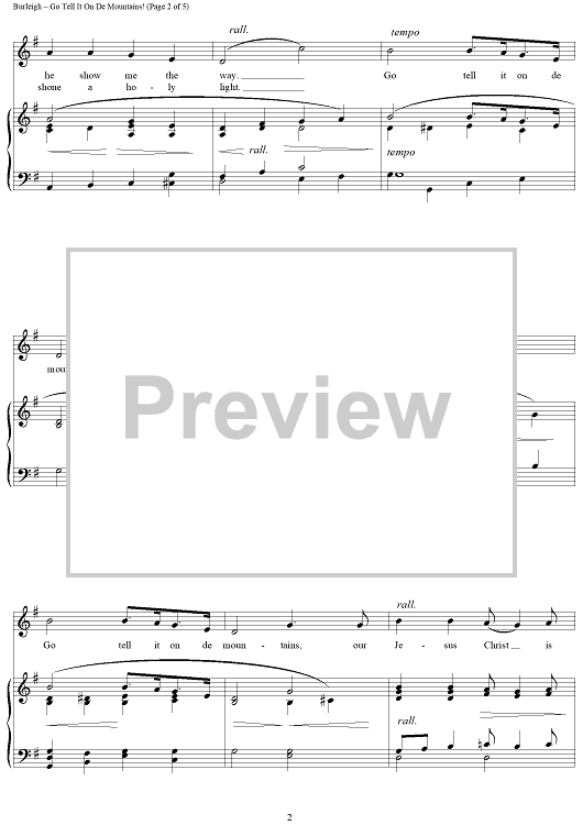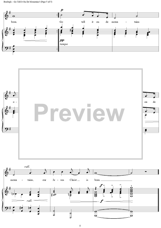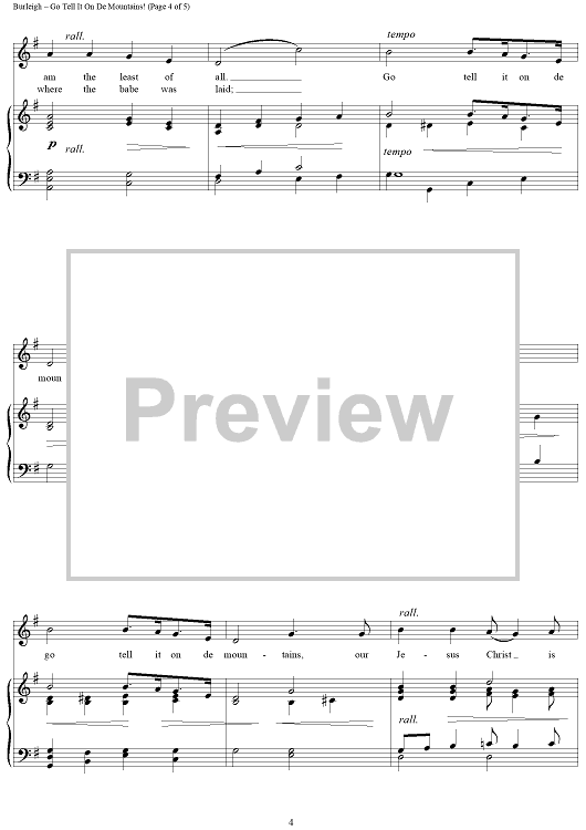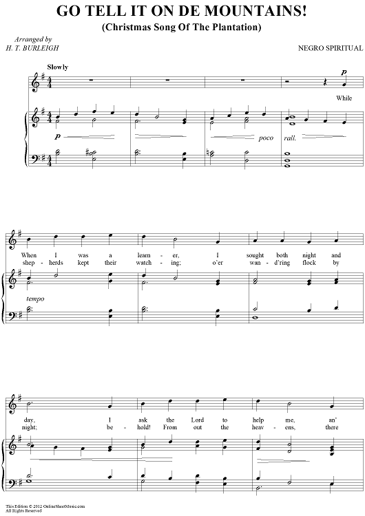 Digital Sheet Music for Go Tell It On De Mountains! (Christmas Song Of The Plantation) by H. T. Burleigh, African American Spiritual scored for Piano/Vocal; id:433138