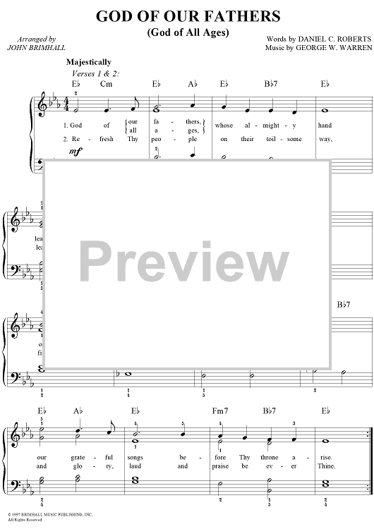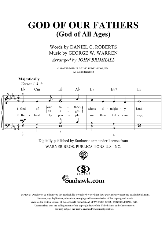 Digital Sheet Music for God Of Our Fathers (God Of All Ages) by John Brimhall, Daniel C. Roberts, George Warren scored for Easy Piano/Vocal; id:264544