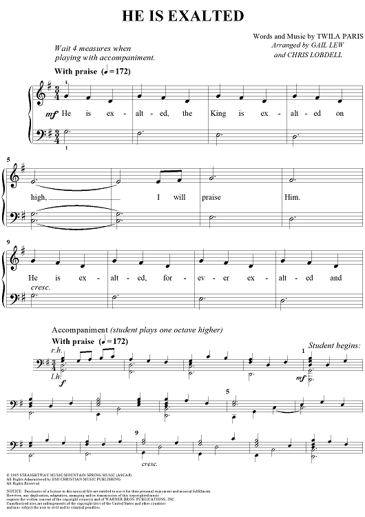 Digital Sheet Music for He Is Exalted by Twila Paris, Gail Lew, Chris Lobdell scored for Easy Piano/Vocal; id:304358