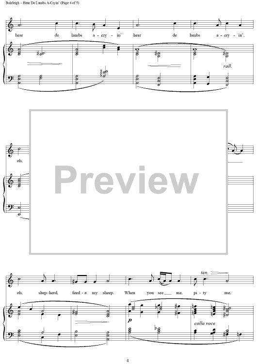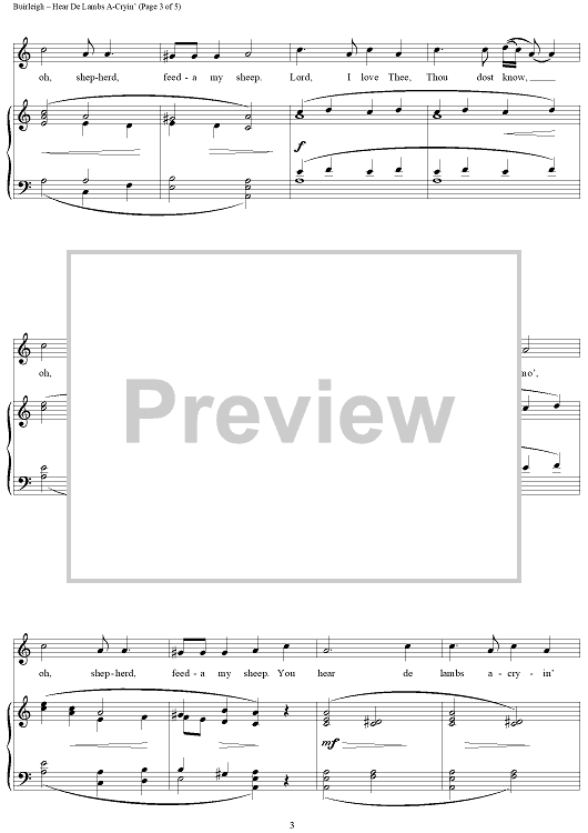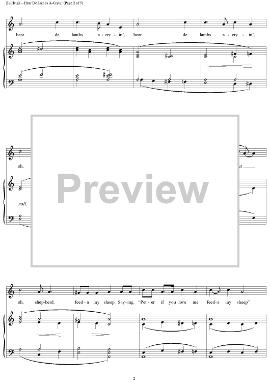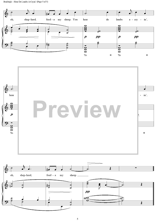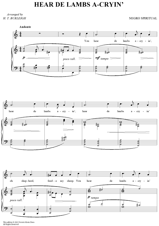 Digital Sheet Music for Hear De Lambs A-Cryin' by H. T. Burleigh, African American Spiritual scored for Piano/Vocal; id:433196