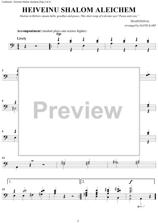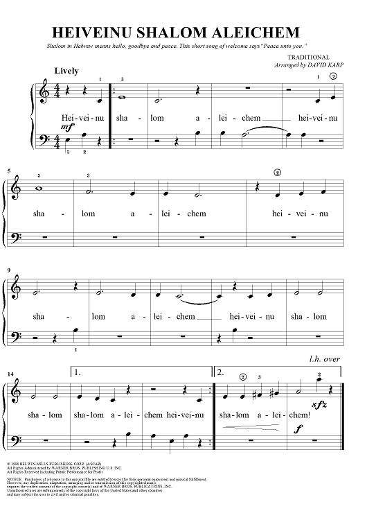 Digital Sheet Music for Heiveinu Shalom Aleichem by David Karp, Traditional scored for Easy Piano/Vocal; id:154751