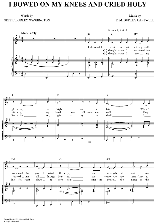 Digital Sheet Music for I Bowed on My Knees and Cried Holy by E. M. Dudley Cantwell, Nettie Dudley Washington scored for Piano/Vocal/Chords; id:356047