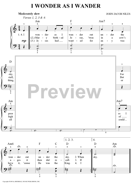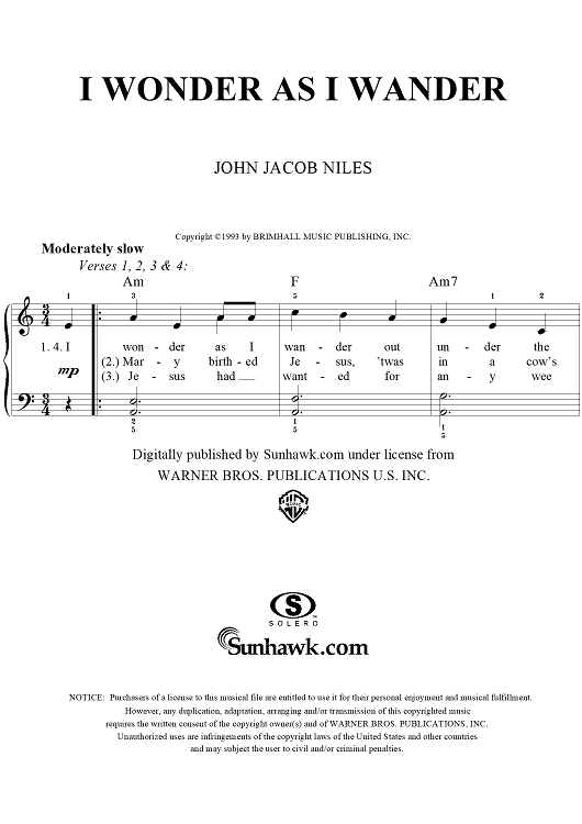 Digital Sheet Music for I Wonder As I Wander by John Jacob Niles, John Brimhall scored for Easy Piano/Vocal; id:253171