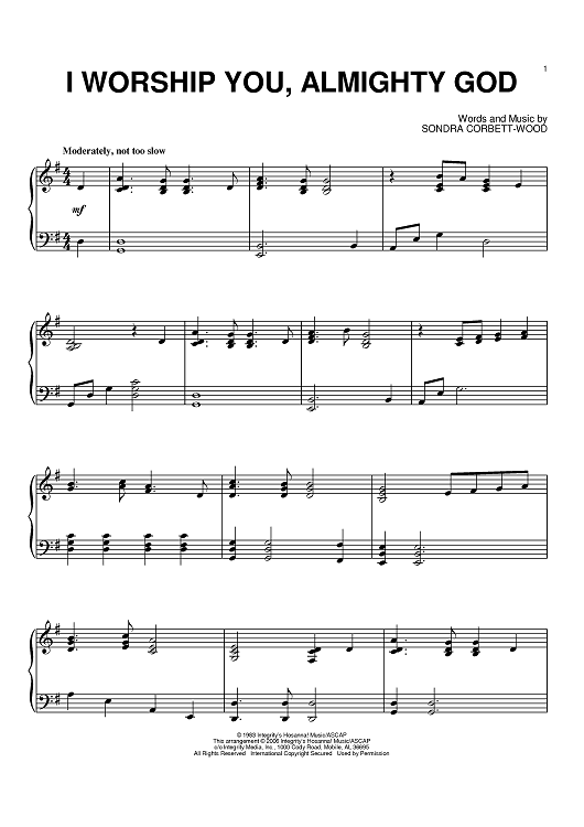Digital Sheet Music for I Worship You, Almighty God by Sondra Corbett-Wood scored for Piano; id:393249