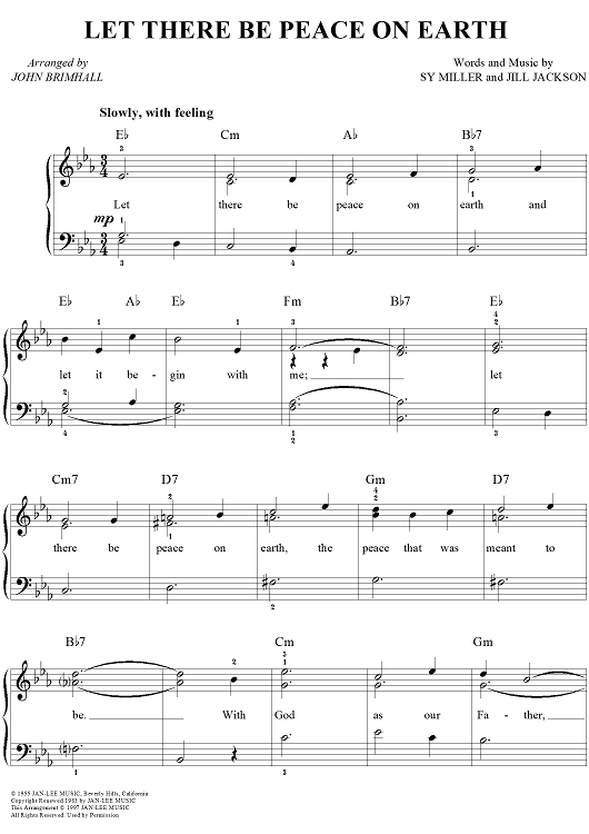 Digital Sheet Music for Let There Be Peace On Earth by Sy Miller, Jill Jackson, John Brimhall scored for Easy Piano/Vocal; id:251715