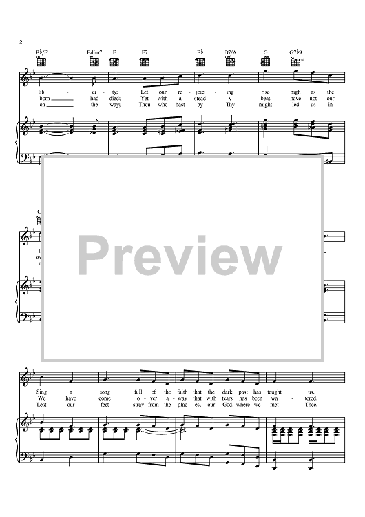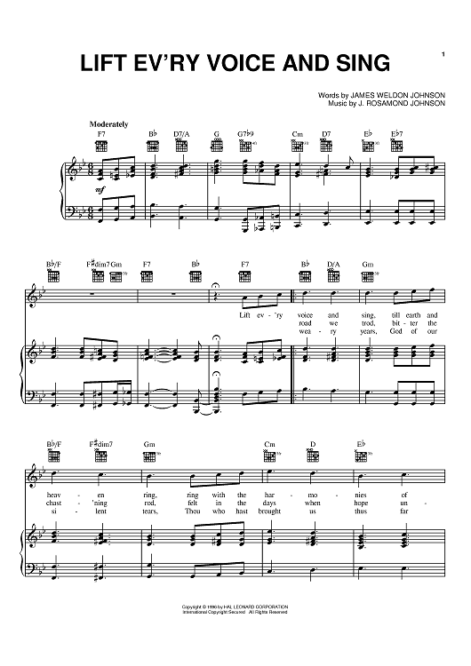 Digital Sheet Music for Lift Ev'ry Voice And Sing by J. Rosamond Johnson, James Weldon Johnson scored for Piano/Vocal/Chords; id:368084