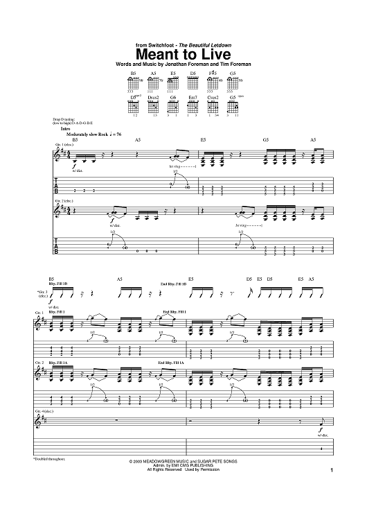 Digital Sheet Music for Meant To Live by Jonathan Mark Foreman, Switchfoot, Tim Foreman scored for Guitar Tab; id:381962