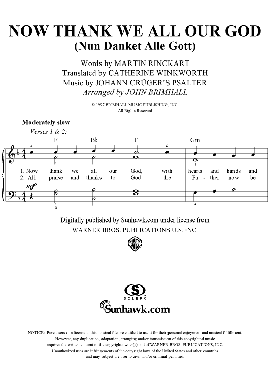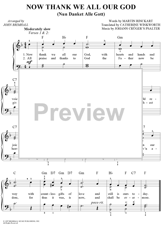Digital Sheet Music for Now Thank We All Our God (Nun Danket Alle Gott) by Johann Crüger, John Brimhall, Martin Rinckart scored for Easy Piano/Vocal; id:272035