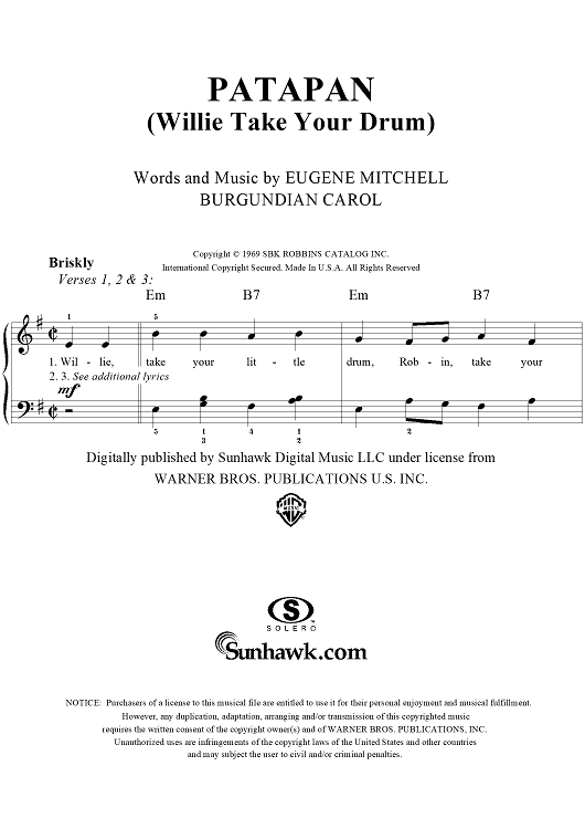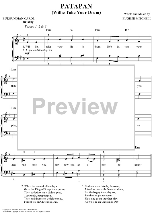 Digital Sheet Music for Patapan (Willie Take Your Drum) by Eugene Mitchell scored for Easy Piano/Vocal; id:251334