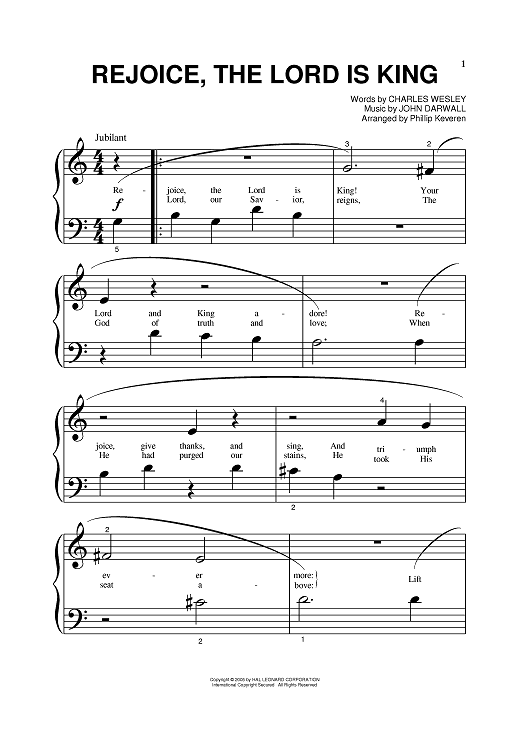 Digital Sheet Music for Rejoice, The Lord Is King by Charles Wesley, John Darwall, Phillip Keveren scored for Big Note Piano; id:385040