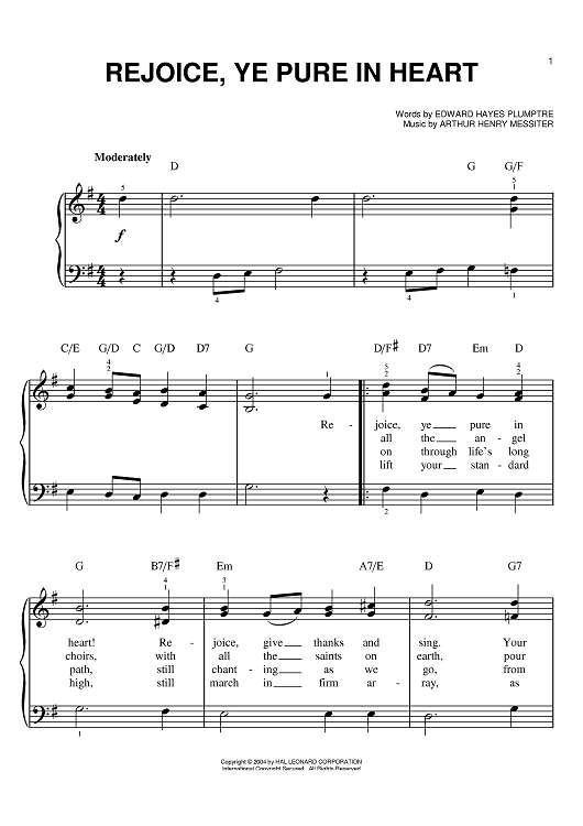 Digital Sheet Music for Rejoice, Ye Pure In Heart by Edward Plumptre, Arthur Henry Messiter scored for Easy Piano; id:381107