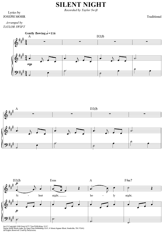 Digital Sheet Music for Silent Night by Josef Mohr, Traditional, Taylor Swift scored for Piano/Vocal/Chords; id:438278