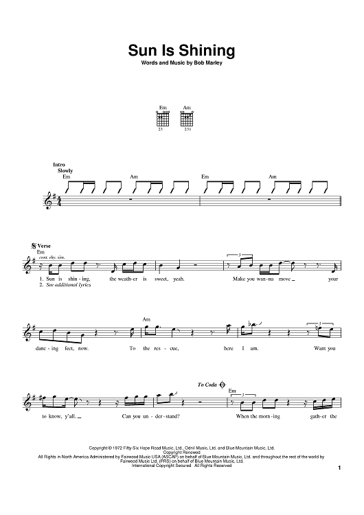 "Sun Is Shining" Sheet Music by Bob Marley