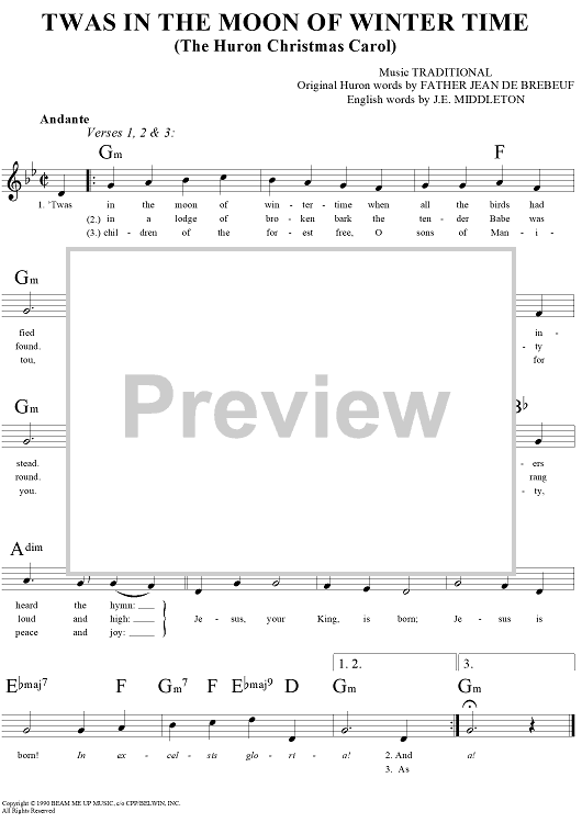 Digital Sheet Music for Twas in the Moon of Winter Time (The Huron Christmas Carol) by J. E. Middleton, Traditional scored for Lead Sheet; id:262215