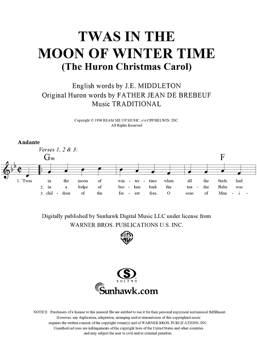 "Twas in the Moon of Winter Time (The Huron Christmas Carol)" Sheet Music by Traditional