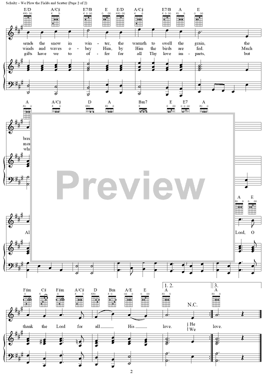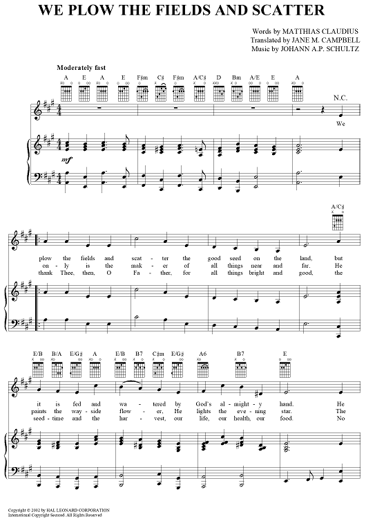 Digital Sheet Music for We Plow The Fields And Scatter by Matthias Claudius, Johann Abraham Peter Schulz scored for Piano/Vocal/Chords; id:367614