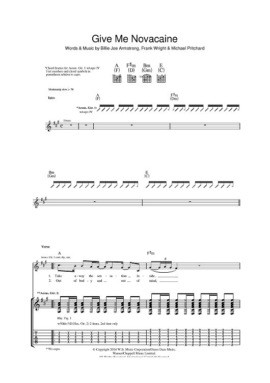 Digital Sheet Music for Give Me Novacaine by Billie Joe Armstrong, Michael Pritchard, Frank Wright, Green Day scored for Guitar Tab; id:396373