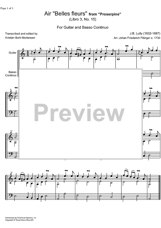 Digital Sheet Music for Air Belles Fleurs from Proserpine Libro 3 No. 5 by Jean-Baptiste Lully, Johan Friederich Fibiger scored for Guitar/Continuo; id:327409