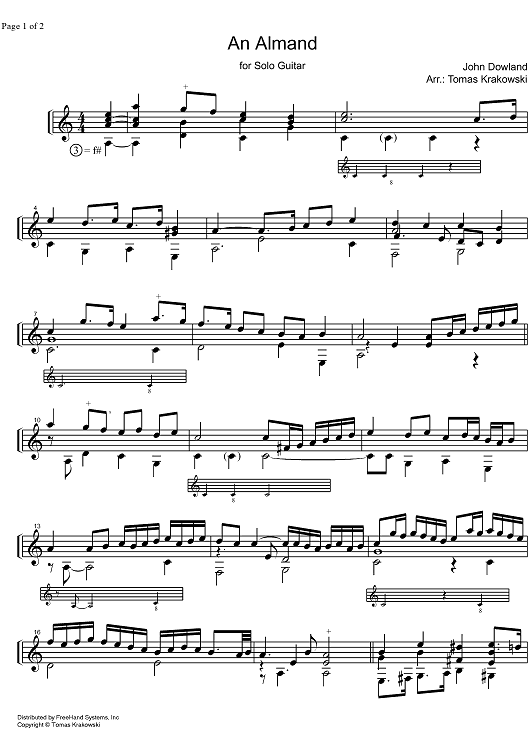 Digital Sheet Music for An Almand by John Dowland, Tomas Krakowski scored for Guitar; id:327032