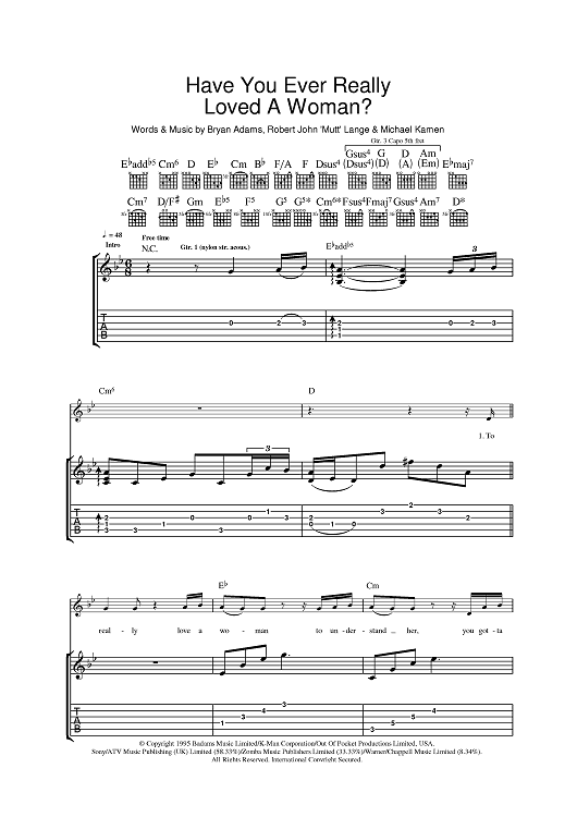 Digital Sheet Music for Have You Ever Really Loved A Woman? by Bryan Adams, Michael Kamen, Robert Lange scored for Guitar Tab; id:393162