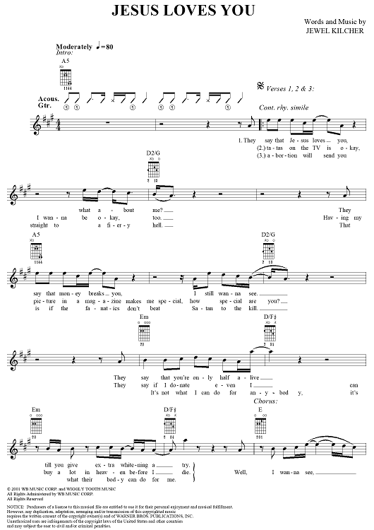 Digital Sheet Music for Jesus Loves You by Jewel, Jewel Kilcher scored for Guitar/Vocal; id:288385