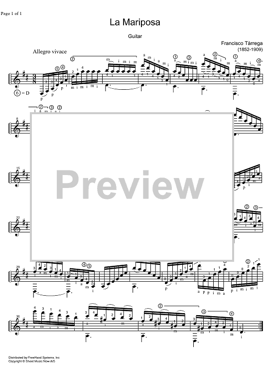 Digital Sheet Music for La Mariposa by F. Tarrega scored for Guitar; id:327494
