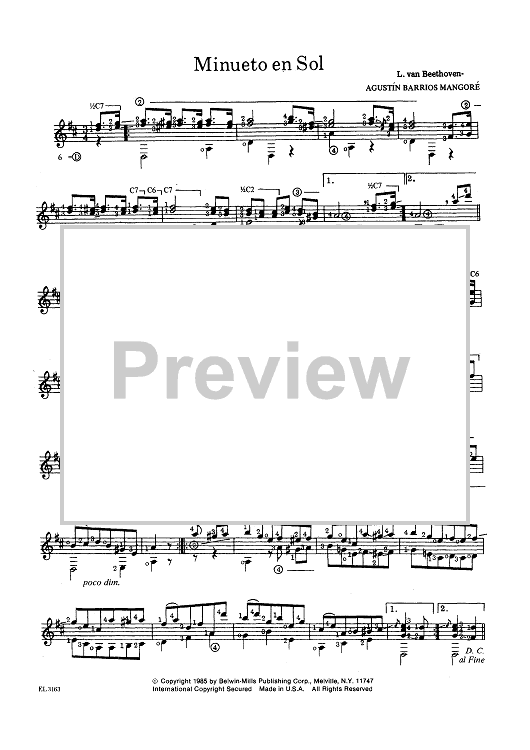 Digital Sheet Music for Minueto en Sol by Ludwig van Beethoven, Agustin Barrios Mangore scored for Guitar Solo; id:454204