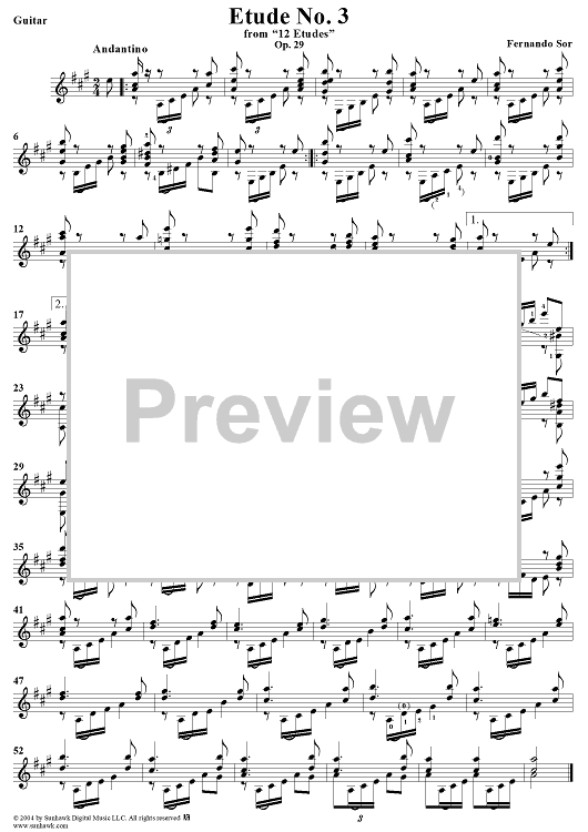 Digital Sheet Music for Twelve Etudes, Op. 29, No. 3: Andantino by Fernando Sor scored for Guitar Solo; id:297873