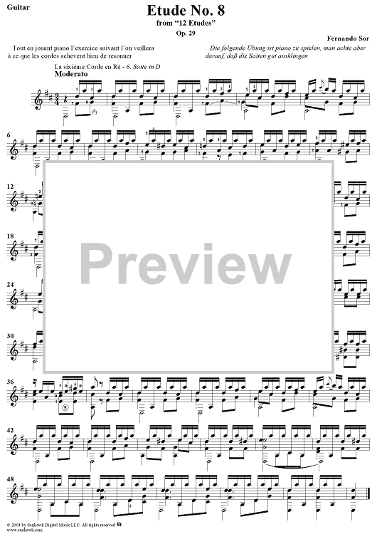 Digital Sheet Music for Twelve Etudes, Op. 29, No. 8: Moderato by Fernando Sor scored for Guitar Solo; id:297877