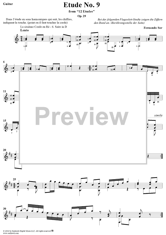 Digital Sheet Music for Twelve Etudes, Op. 29, No. 9: Lento by Fernando Sor scored for Guitar Solo; id:297878