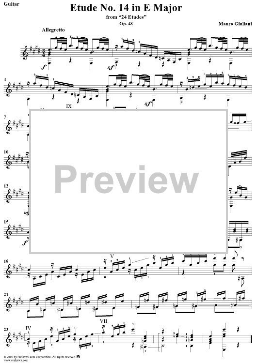 Digital Sheet Music for Twenty-Four Etudes, op. 48, no. 14 in E major by Mauro Giuliani scored for Guitar Solo; id:197224