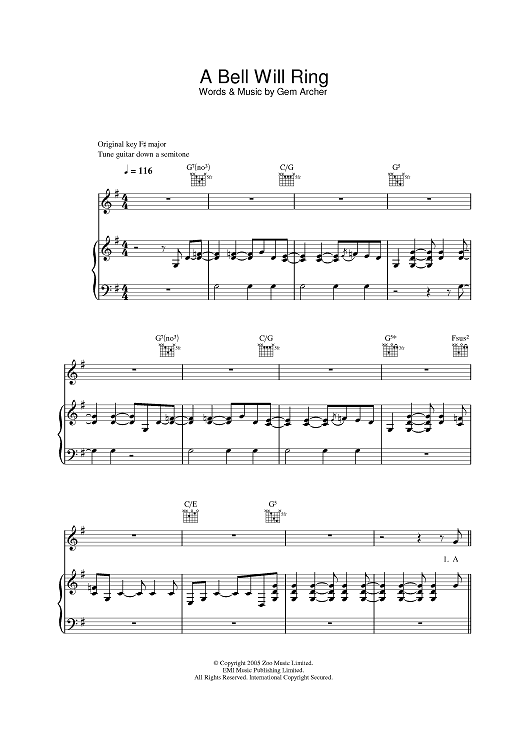 Digital Sheet Music for A Bell Will Ring by Oasis, Gem Archer scored for Piano/Vocal/Chords; id:387463