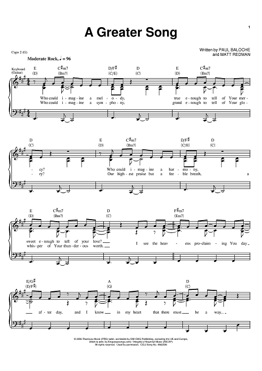 Digital Sheet Music for A Greater Song by Matt Redman, Paul Baloche scored for Piano/Vocal/Chords; id:394034