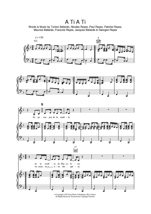 Digital Sheet Music for A Ti A Ti by Jacques Baliardo, Maurice Baliardo, Tonino Baliardo, Gipsy Kings, Francois Reyes, Georges Reyes, Nicolas Reyes, Patchai Reyes, Paul Reyes scored for Piano/Vocal/Chords; id:395687