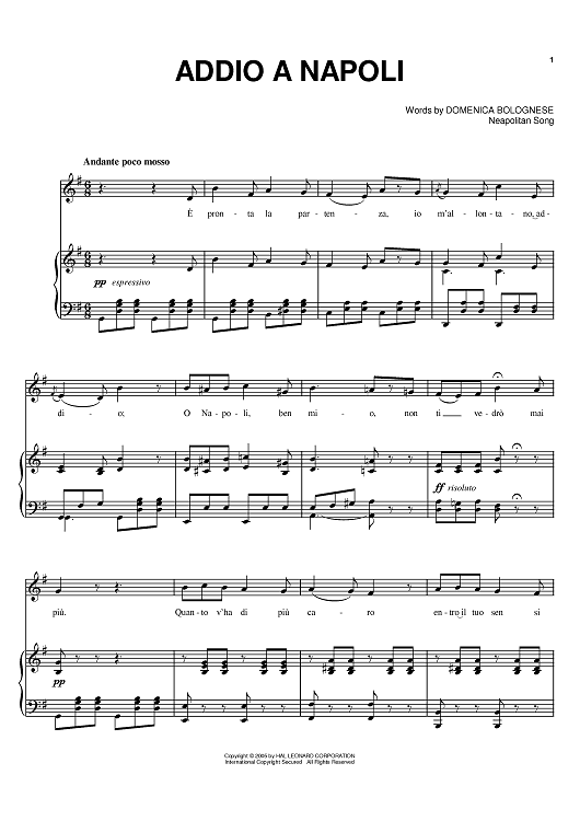 "Addio a Napoli" Sheet Music by Domenico Bolognese