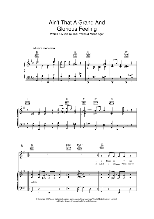 Digital Sheet Music for Ain't That A Grand And Glorious Feeling by Milton Ager, Jack Yellen scored for Piano/Vocal/Chords; id:392753
