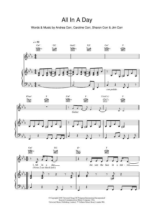 Digital Sheet Music for All In A Day by The Corrs, Sharon Corr, Caroline Corr, Andrea Corr, Jim Corr scored for Piano/Vocal/Chords; id:377116