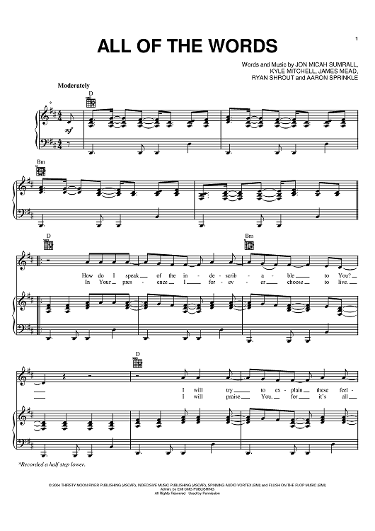 Digital Sheet Music for All Of The Words by Jon Micah Sumrall, Wild Boar, Kutless, James R. Mead, Kyle Mitchell, Ryan Shrout scored for Piano/Vocal/Chords; id:383872