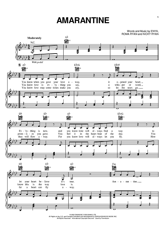 Digital Sheet Music for Amarantine by Enya, Nicky Ryan, Roma Ryan scored for Piano/Vocal/Chords; id:388782