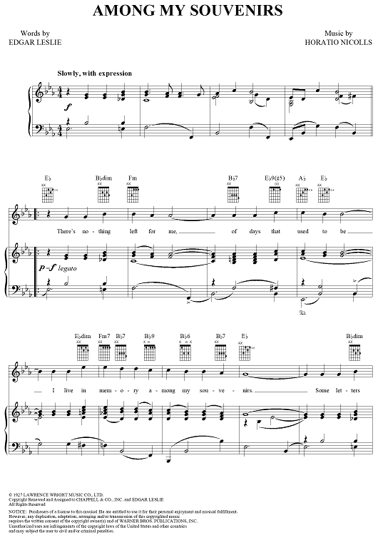 Digital Sheet Music for Among My Souvenirs by Frank Sinatra, Edgar Leslie, Horatio Nicolls scored for Piano/Vocal/Chords; id:288008