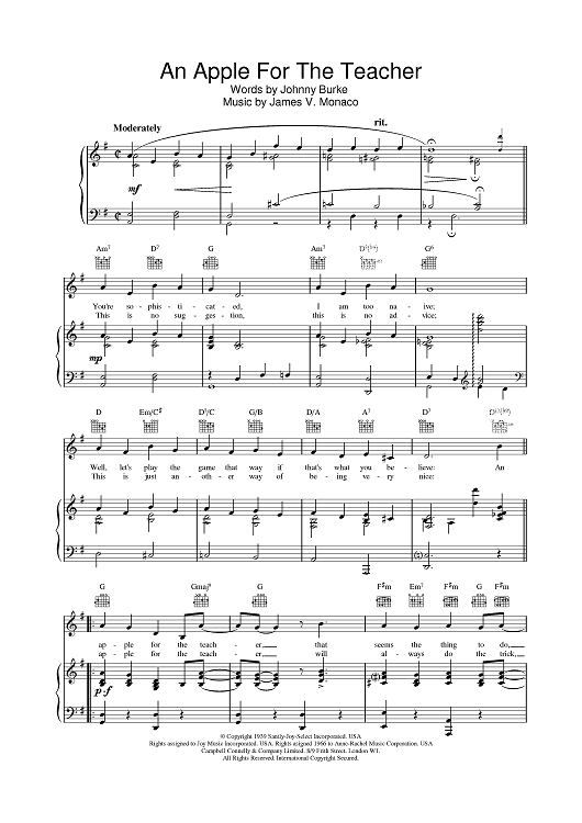 Digital Sheet Music for An Apple For The Teacher by James V. Monaco, Johnny Burke scored for Piano/Vocal/Chords; id:376925