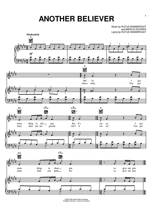 Digital Sheet Music for Another Believer by Marius De Vries, Rufus Wainwright scored for Piano/Vocal/Chords; id:397534