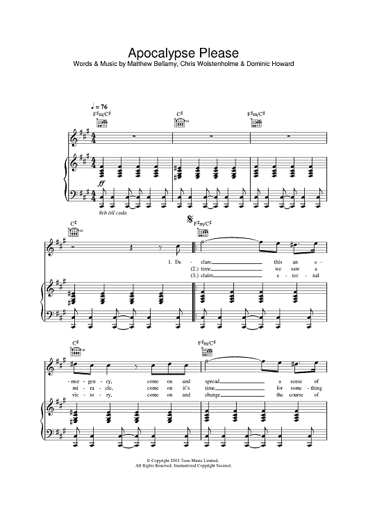 Digital Sheet Music for Apocalypse Please by Matthew Bellamy, Dominic Howard, Muse, Chris Wolstenholme scored for Piano/Vocal/Chords; id:384524